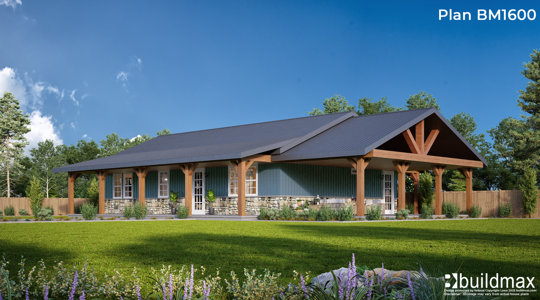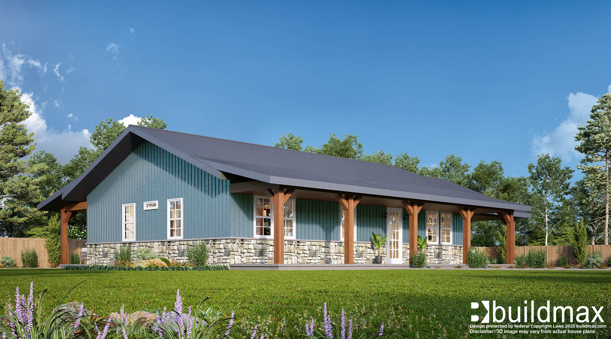 This quaint barndominium is a dream. When entering, you are greeted by a living room with open sightlines to the kitchen. Off the kitchen is mud/laundry room that leads to a space that can be used as either a car port or a porch. The master suite is a perfect retreat, and the porches allow for peaceful lounging.ย This barndominium can be built using a metal building kit, post frame kit, or a conventional wood frame kit giving you a total pricing advantage no matter what market you are in.ย