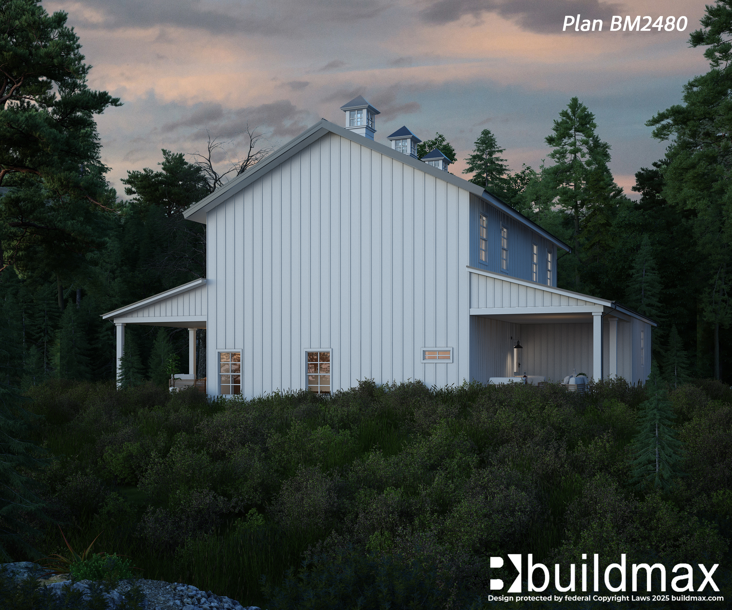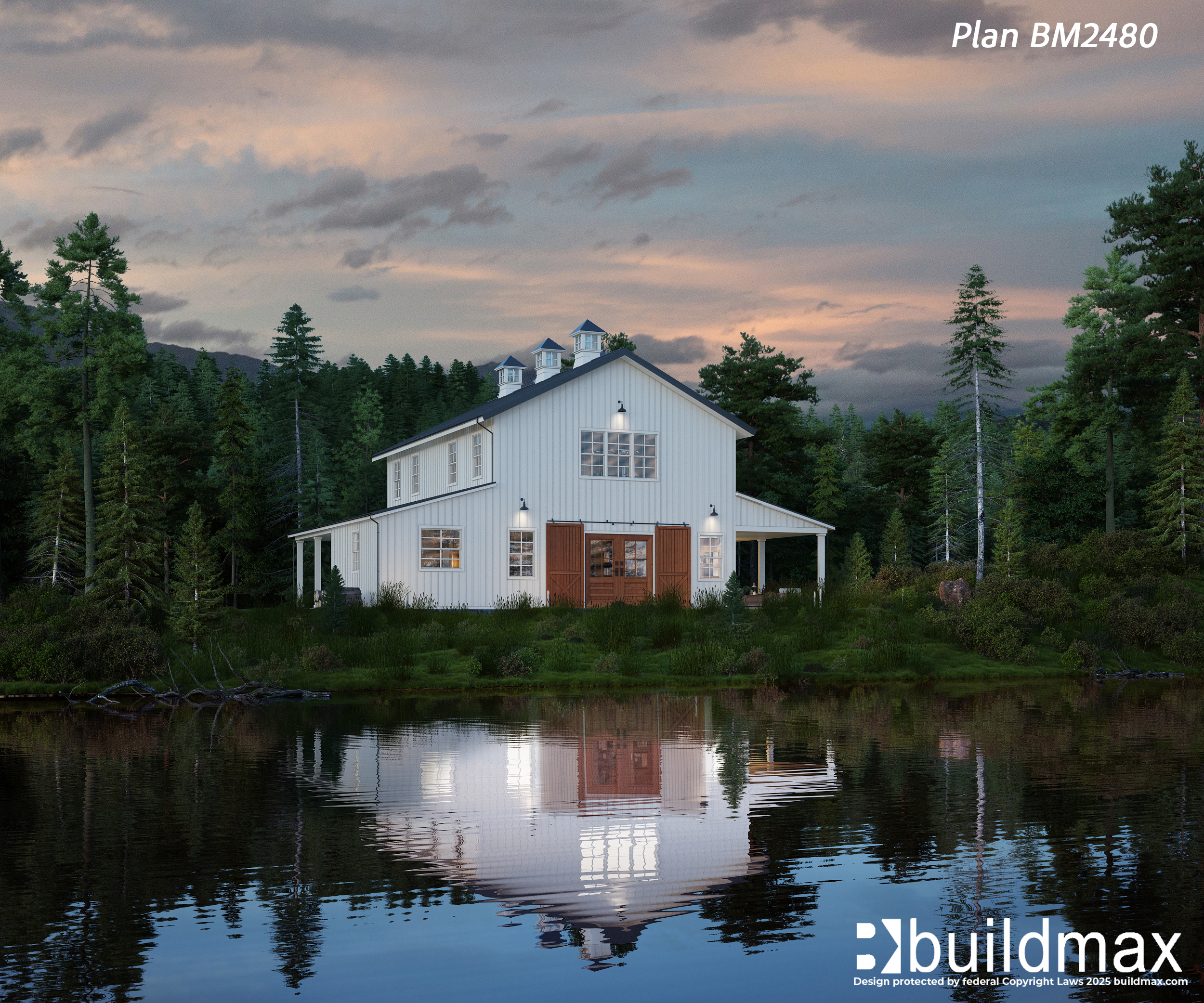 This barndominium plan is a 4 bedroom, 2.5 bath barndo. This lakeside barndominium features a large master suite on the first floor, complete with a sizeable bathroom and a large walk-in closet. The second floor features 3 bedrooms and a sizeable loft that offers plenty of flexible space. This barndominium can be built using a metal building kit, post frame kit, or a conventional wood frame kit giving you a total pricing advantage no matter what market you are in.