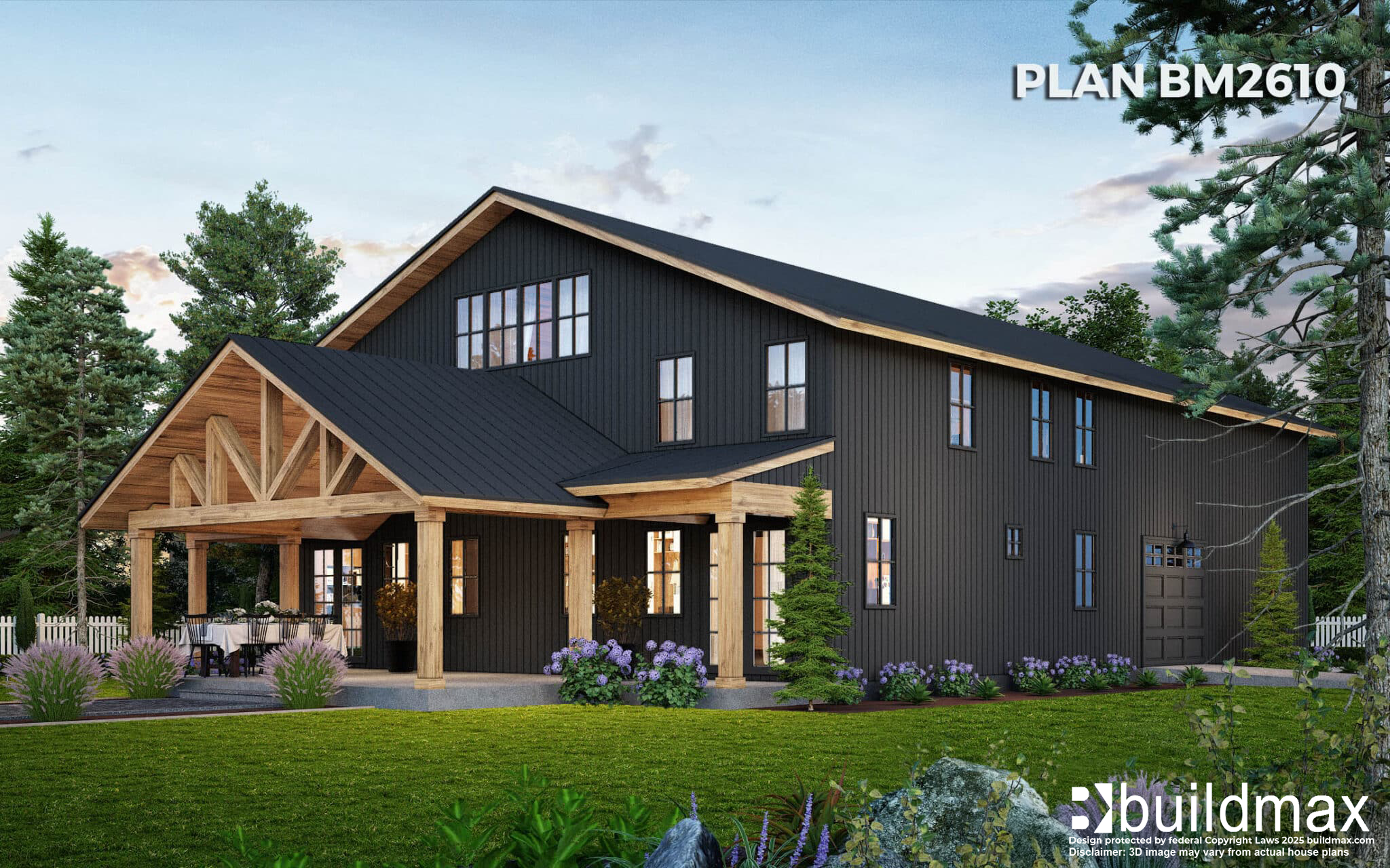 The BM2610 shophouse is a 2,610 SF of living space and a 1500+ SF garage/shop. The exterior of the home can be considered a modern barndominium but with the attached garage you can also consider it a Shophouse. Either way this stunning stealthy home has lots of wood accents that give it a rustic vibe. The large exterior wooden post and beams stand out against the black metal siding. Upon entering the home you are greeted by a 2 story great room and an oversized kitchen with a 10 foot island. A walk-in corner pantry is a nice added feature. The large master suite has a his and her walk-in closet and the master bath has room for a freestanding slipper tub and a six foot custom shower. The second story has 3 bedrooms, two bathrooms and an office. Overall there is a ton of features packed into this 2,600 SF home.