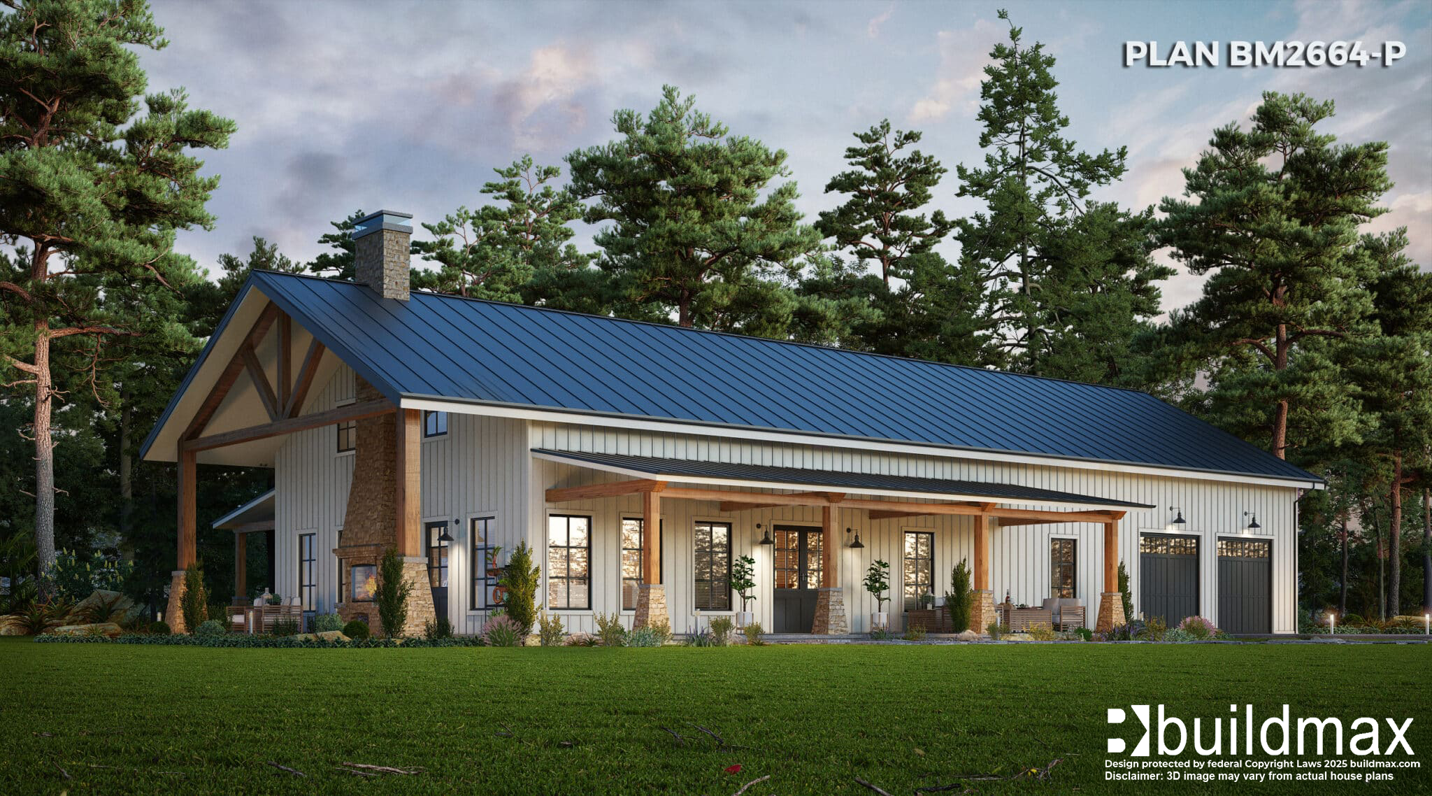 This barndominium floor plan is a 3 bed, and 2 and a half bath barndominium plan. With the space in the garage, this plan can double as a shophouse. The great room has a vaulted ceiling and fireplace. The master suite has a bathroom with a wet shower and double vanities. The two bedrooms share a Jack and Jill bathroom. An attached 2 car garage leaves plenty of space for a shop. This version of our BM2664 adds a lofty porch and outdoor fireplace, making it the perfect entertaining space. This barndominium can be built using a metal building kit, post frame kit, or a conventional wood frame kit giving you a total pricing advantage no matter what market you are in.
