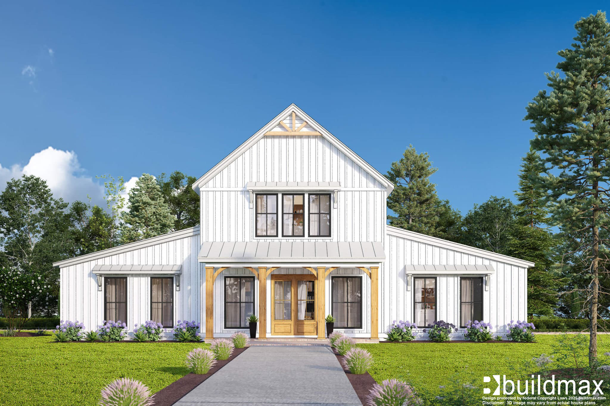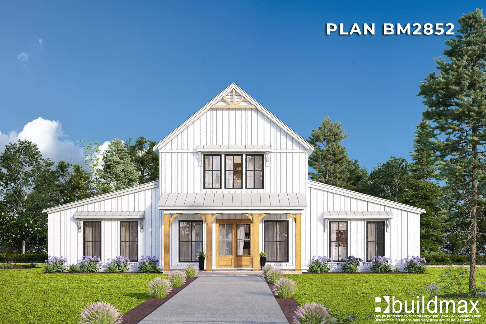 A gorgeous family sized barndominium with lots of space, high ceilings and awesome amenities. A classic monitor style barndo with windows awnings and wood accents greets visitors as they approach the covered front porch. This beautiful barndominium would fit perfectly in a neighborhood or a country setting. Upon entering the home the room is flooded with lots of natural light from all angles of the great room. The open staircase leads to a balcony and a private bedroom with a large bathroom. The kitchen, dining and great room have an open floor plan concept. The sliding doors from the kitchen leads to a large 14’X56′ covered entertaining porch. The master suite has a walk-in closet, custom shower and a freestanding tub. Three bedrooms on the first floor have an oversized bathroom with triple vanity sinks for a growing family with kids. The BM2852 is a perfect home for a growing family or a family that loves to entertain.ย