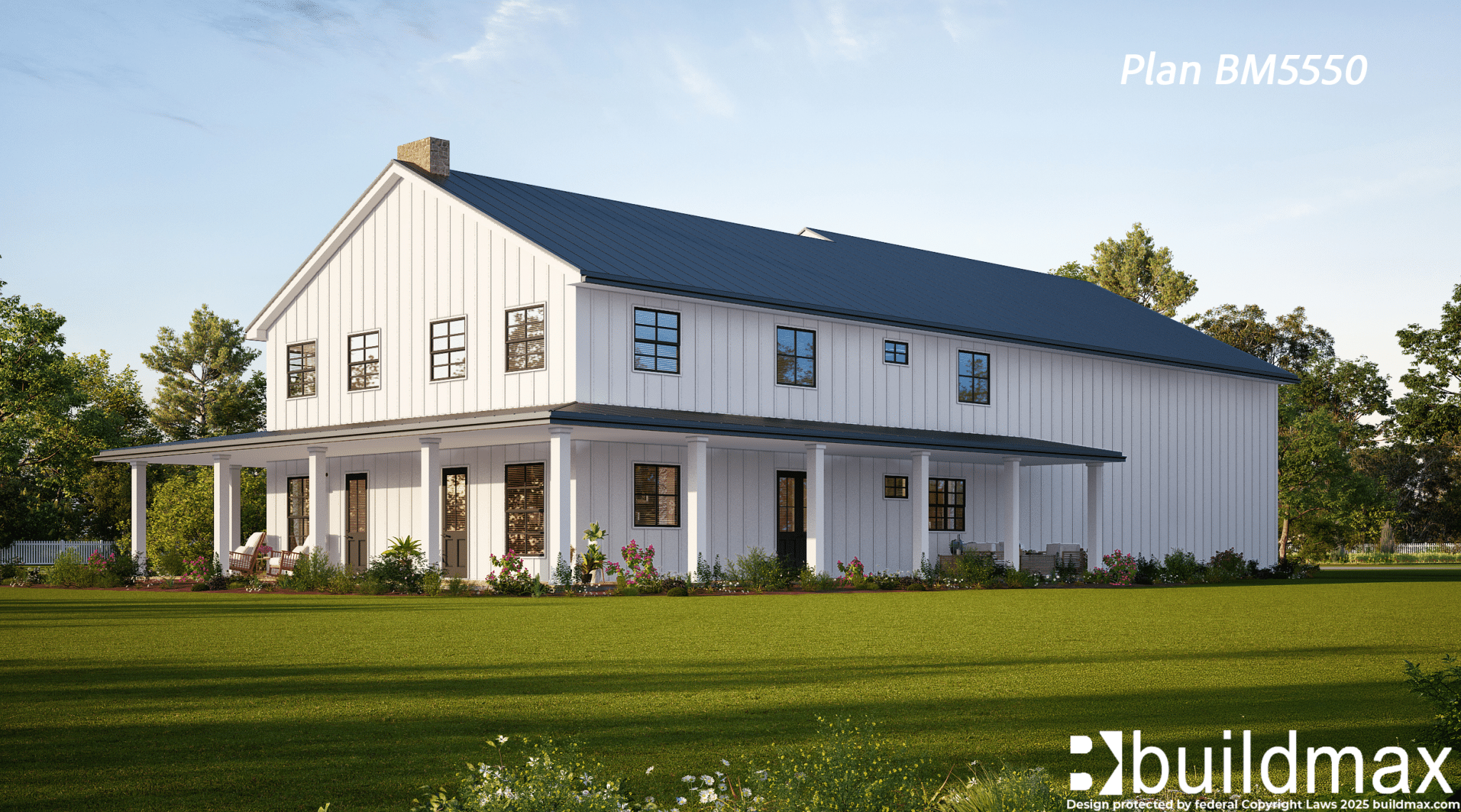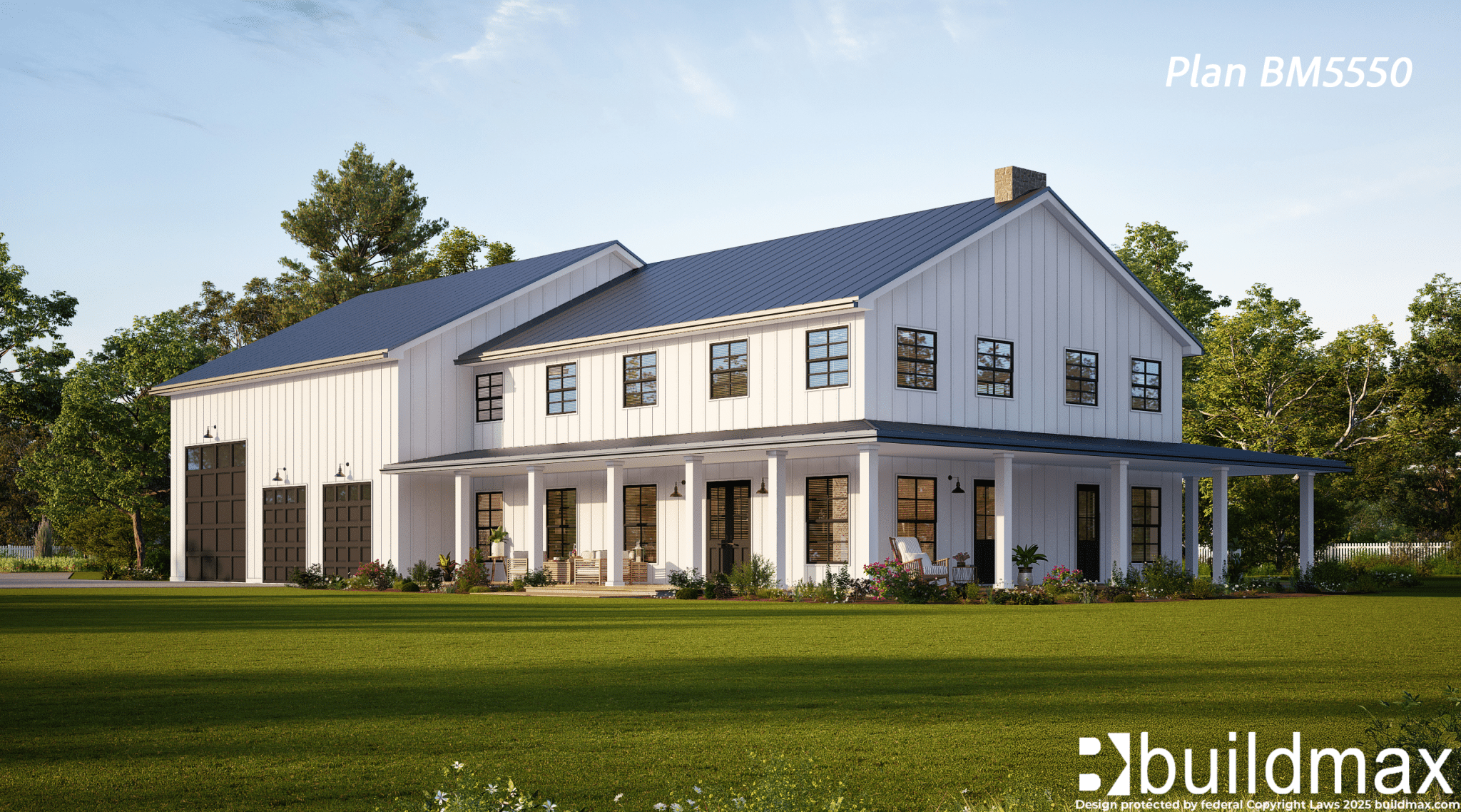 BM5550 shophouse house plan that has everything from a large garage/shop to a gorgeous living space that can be decorated in farmhouse, elegant or country style. The choices are endless with this home. The garage has room for an RV if needed or you can design it with a simple 2, 3 or 4 car garage/shop. The living space is as inviting as anything you have ever seen. A wrap around porch gives you plenty of living space and outdoor dining areas are abundant. A two story vaulted great room can have a flat ceiling or vaulted based on the trusses you use. The open living space will allow you to spend time with family no matter what room they are in on the first floor. A large two story fireplace in the living room will be the focal point as you enter this amazing home. The siding and roof color choices are endless. Let’s take your dream floor plan and make it a reality. Our collection of Shophouse floor plans is a variety of one story plans and two story house plans that are easy to build.