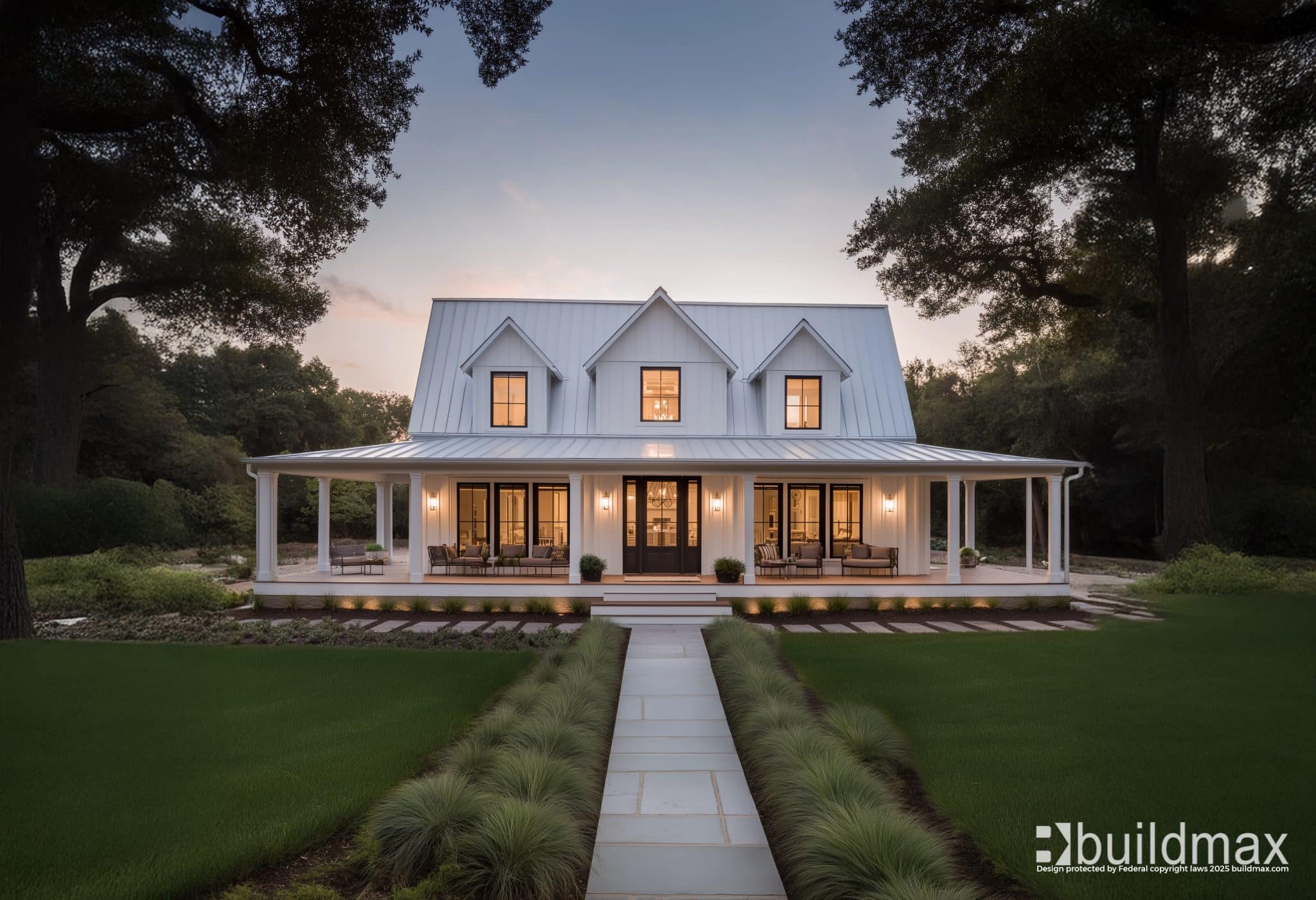 This modern farmhouse plan is a 3 bedroom, 2 and a half bath farmhouse with a 2 car garage. The living space flows seamlessly into the kitchen, which features a large island and pantry. The master suite features a large master bath and spacious walk in closet. Upstairs are the remaining two bedrooms and a sizeable bathroom. The wraparound porch leads to the 2-car garage nestled on the back side of the house.ย This modern farmhouse can be built using a metal building kit or a conventional wood frame kit giving you a total pricing advantage no matter what market you are in.
