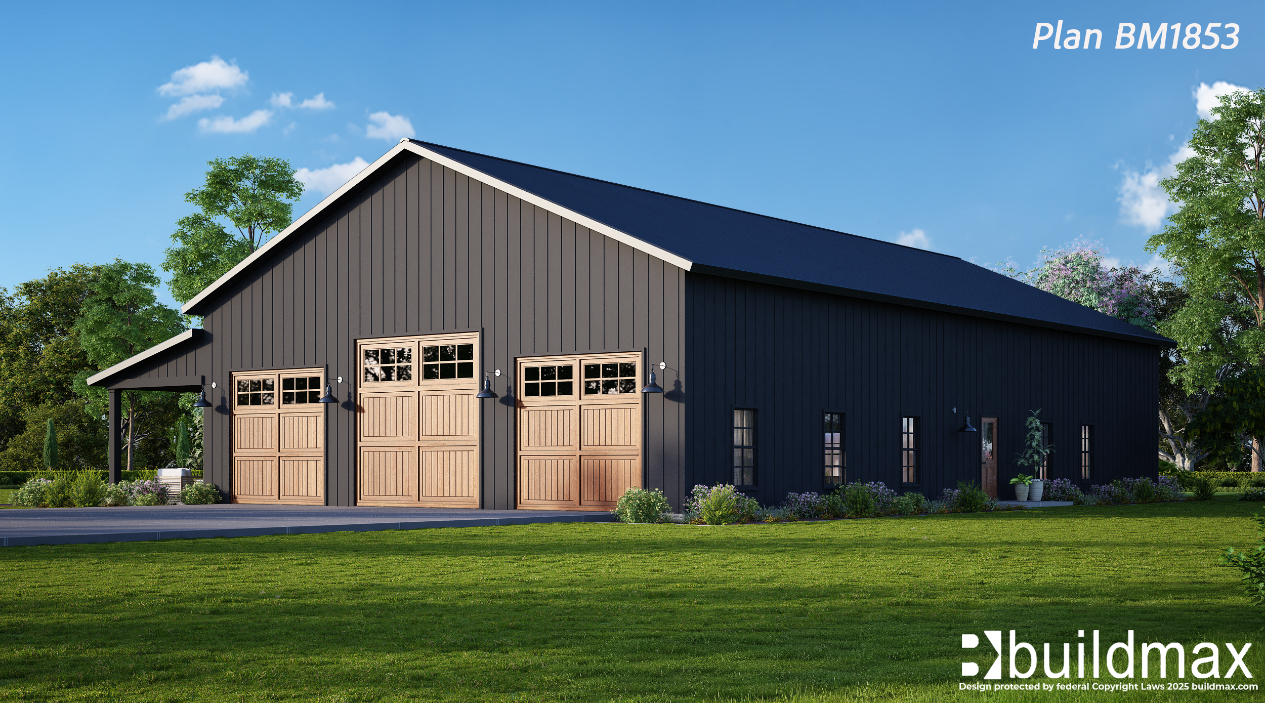 All plans are designed as conventional wood or conventional steel stud framing (2×6 exterior, 2×4 interior) using a monolithic slab foundation. Post frame foundation and post framing details will require a modification fee. Our plans are not designed in red iron steel. If you plan to use a red iron steel company, you can purchase our licensed plan and the red iron company will use our plan with their software to produce the red iron shell package. CAD files are available for an extra fee if a steel manufacturer, post frame company or local engineer requires them.